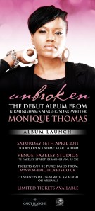 This year is shaping up to be an important one for Monique Thomas. 2011 started with the release of her single Colourful and now she’s about to release her debut album, Unbroken.
